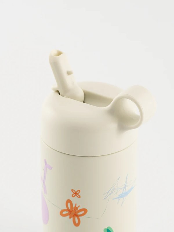 Dziecięca butelka ze stali nierdzewnej EQUA Bounce Yard w naturalnym piaskowym odcieniu z zabawnymi detalami łączy w sobie styl, wytrzymałość i bezpieczeństwo – idealny towarzysz codziennego nawodnienia małych odkrywców.