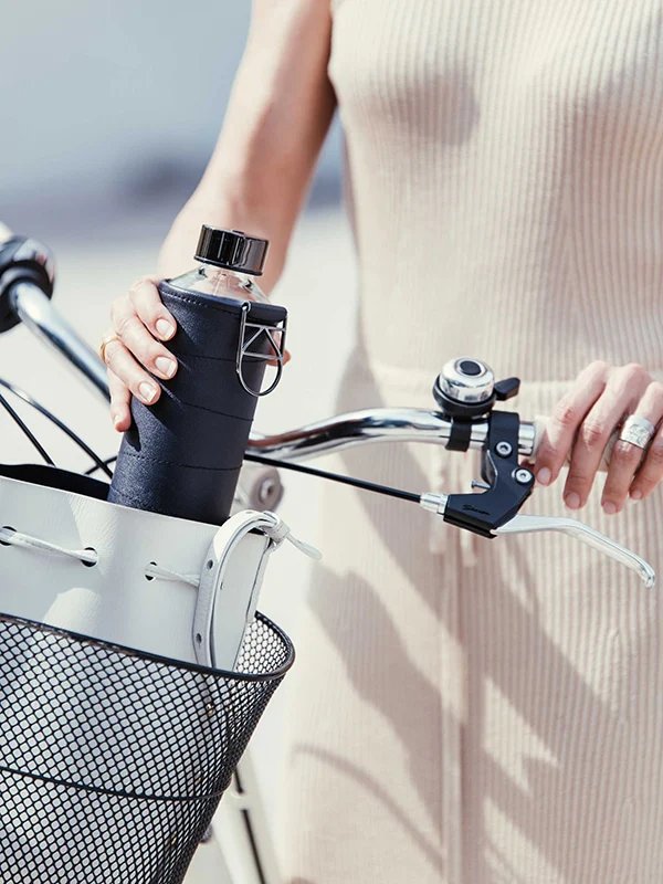 Ekologiczna szklana butelka EQUA wykonana z wytrzymałego i lekkiego szkła borokrzemowego o minimalistycznym designie, zapakowana w eleganckie opakowanie ze sztucznej skóry. Pomoże Ci niezawodnie zadbać o swój rytm picia, jednocześnie zmniejszając zużycie jednorazowych tworzyw sztucznych. Dzięki praktycznemu kształtowi dobrze leży w dłoni. Do tego świetnie wygląda, więc picie z niej każdego dnia to czysta przyjemność.