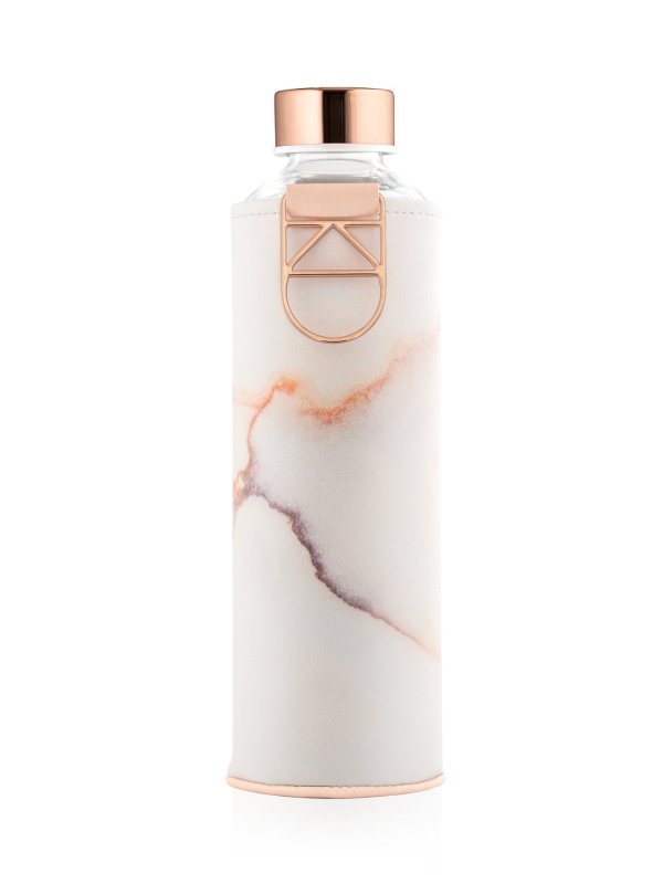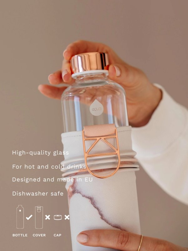 Ekologiczna szklana butelka EQUA wykonana z wytrzymałego i lekkiego szkła borokrzemowego o minimalistycznym designie, zapakowana w eleganckie opakowanie ze sztucznej skóry. Pomoże Ci niezawodnie zadbać o swój rytm picia, jednocześnie zmniejszając zużycie jednorazowych tworzyw sztucznych. Dzięki praktycznemu kształtowi dobrze leży w dłoni. Do tego świetnie wygląda, więc picie z niej każdego dnia to czysta przyjemność.