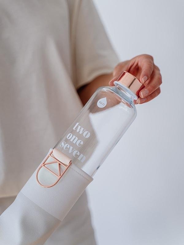Ekologiczna szklana butelka EQUA wykonana z wytrzymałego i lekkiego szkła borokrzemowego o minimalistycznym designie, zapakowana w eleganckie opakowanie ze sztucznej skóry. Pomoże Ci niezawodnie zadbać o swój rytm picia, jednocześnie zmniejszając zużycie jednorazowych tworzyw sztucznych. Dzięki praktycznemu kształtowi dobrze leży w dłoni. Do tego świetnie wygląda, więc picie z niej każdego dnia to czysta przyjemność.